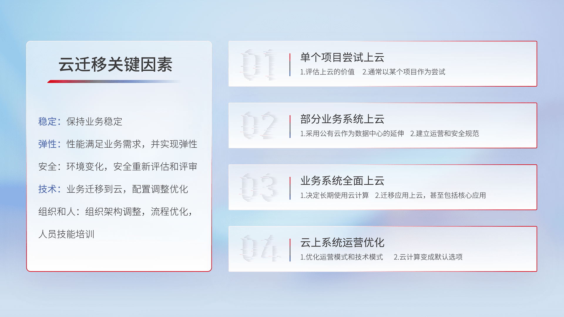 结合实际业务,,,,从规划设计、、、、云平台选型、、、云原生改造、、数据迁移、、集成交付,,,,迁移全过程为客户识别最佳上云路径,,,做好风险识别管理,,,,设计网络架构、、、身份权限、、、、安全审计合规、、、、操作审计、、日志审计、、、、监控告警策略、、多站点容灾设计等,,,对云上基础设施进行整体规划,,提升IT治理水平,,,,以满足弹性、、高可用、、、高性能的需求。。。