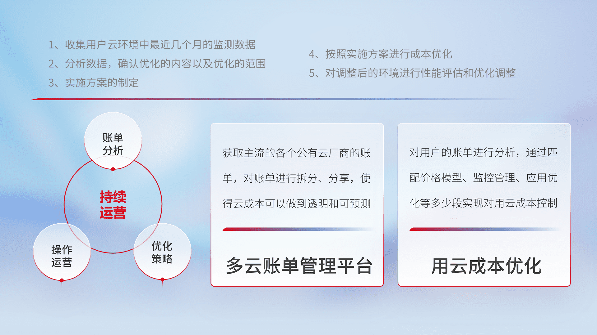 通过多云纳管,,,以统一的资源数据模型把客户的云资源进行抽象和封装,,进而实现对多云资源的统一操作,,保障云资源管理的可靠性、、、稳定性与可用性。。。量身定制化运维内容,,,,配置、、、、开发运维、、、补丁管理、、备份、、监控、、、、认证和访问管理、、、审计和日常巡检等,,,,保障在用云过程中的可靠度,,,稳定度以及高可用率。。。。